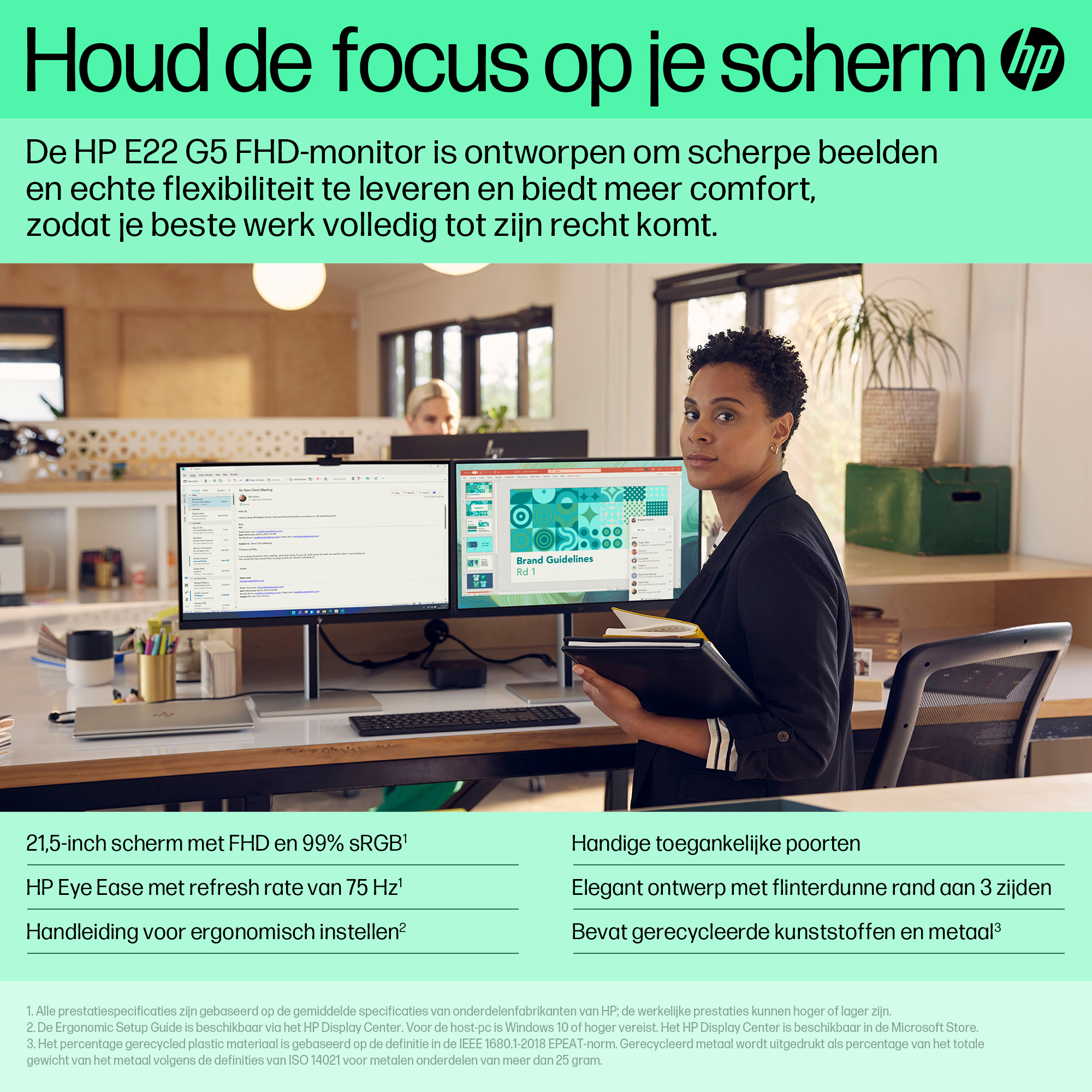 Dieser FHD-Monitor mit einer Diagonale von 21,5 Zoll bietet die Klarheit, die Sie brauchen, um sich auf Ihre Aufgabe zu konzentrieren, wenn der Unterschied im Detail liegt. Dank der satten 99 % sRGB-Farbtiefe und der IPS-Technologie[1] sehen Sie klare, lebendige Farben aus einem großen Betrachtungswinkel[2].