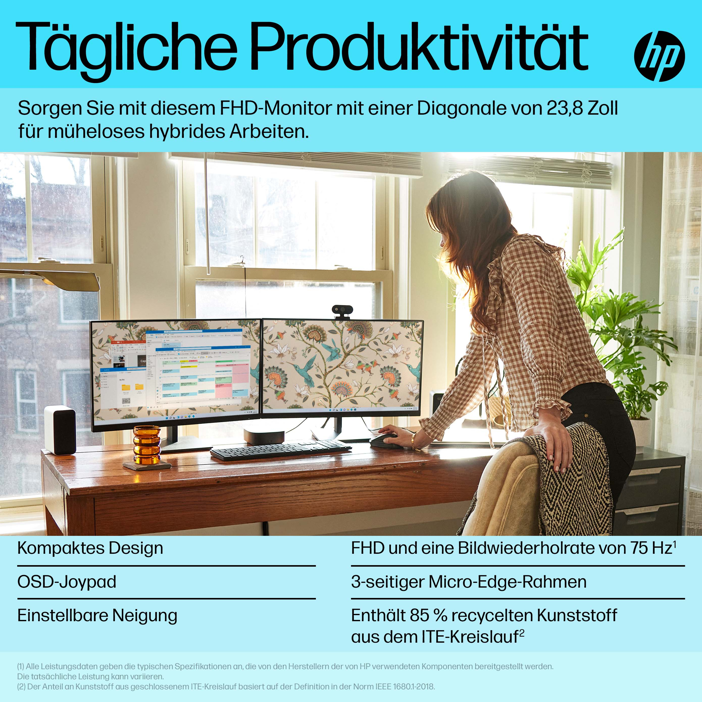 Genießen Sie eine produktive und hybride Arbeitserfahrung mit hervorragenden Ansichten vor dem Bildschirm. Dieser Monitor bietet FHD-Auflösung und eine Bildwiederholrate von 75 Hz[1] für scharfe Bilder und flüssige Bewegungen