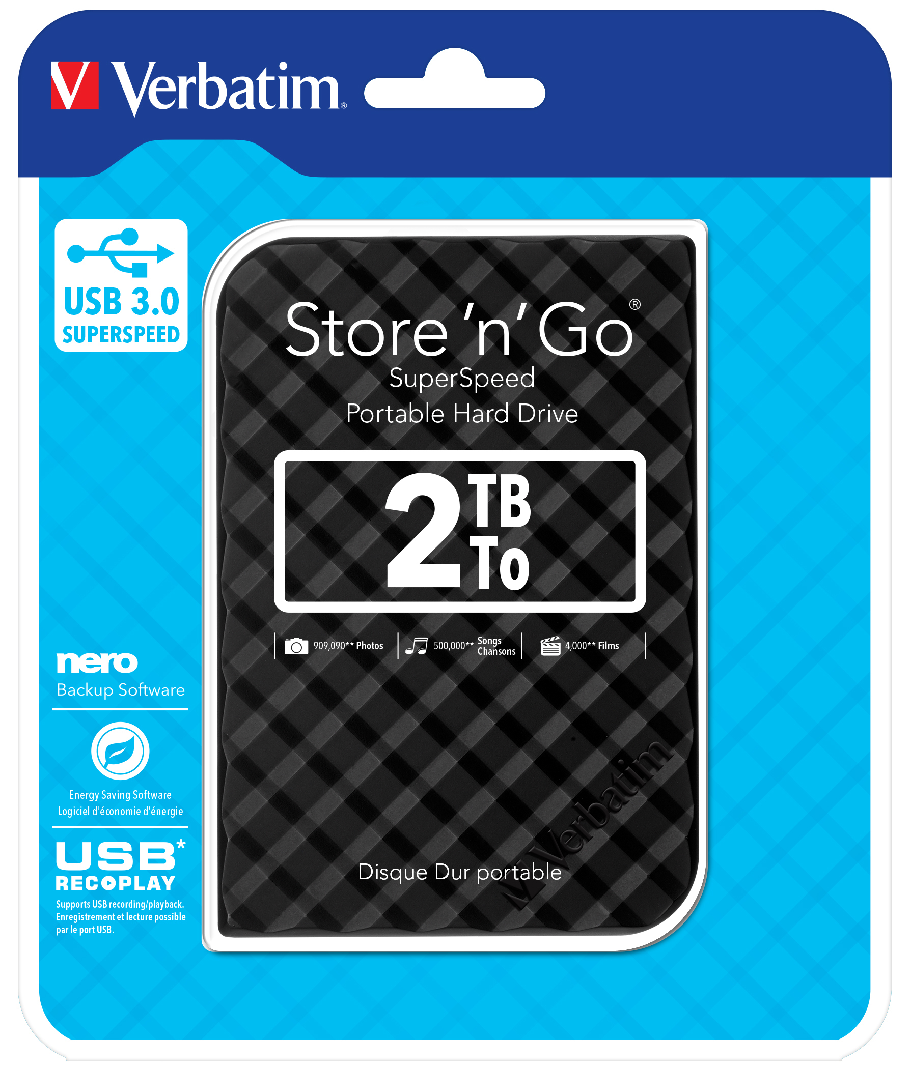 Verbatim Portables Festplattenlaufwerk Store 'n' Go USB 3.0, 2 TB, Schwarz. HDD Kapazität: 2 TB. USB-Version: 3.2 Gen 1 (3.1 Gen 1). HDD Geschwindigkeit: 5400 RPM. Produktfarbe: Schwarz